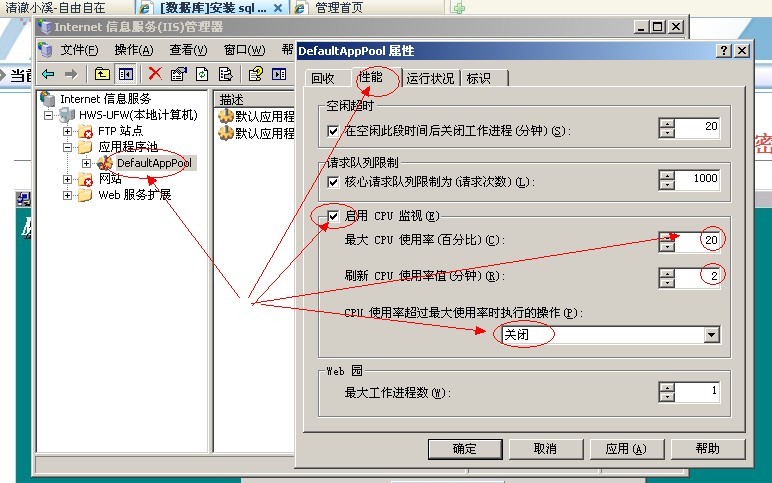 答案:在程序池上右键-属性-性能选项卡里面,把下面的启用CPU监视选择上,然后设置每个程序池的最大CPU使用,默认是100,单位是%,请把100改为20或者其它的,意思是限制每个程序池最大能使用20%的CPU。刷新CPU时间可以根据需要设置,默认为5分钟,不过可以设置为2分钟,这样的话,系统会2分钟自动检查一次CPU使用率,如果超过20%就会自动进行下面的操作。如果选择为无操作,则系统只会记录日志,选择关闭则自动结束进程,释放CPU资源,不过这个程序池不会永久停止,而是自动重新启动,然后隔2分钟后会再次检查这个程序池。
