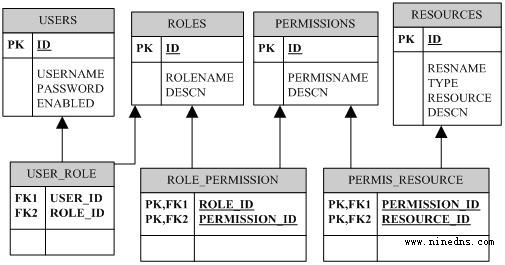 同时,为了更好地配合Acegi安全框架,还引入resource(资源)的概念,资源可分为URL和FUNCTION(方法)两种,一个权限可以对应多个资源。具体的数据库设计见图2。